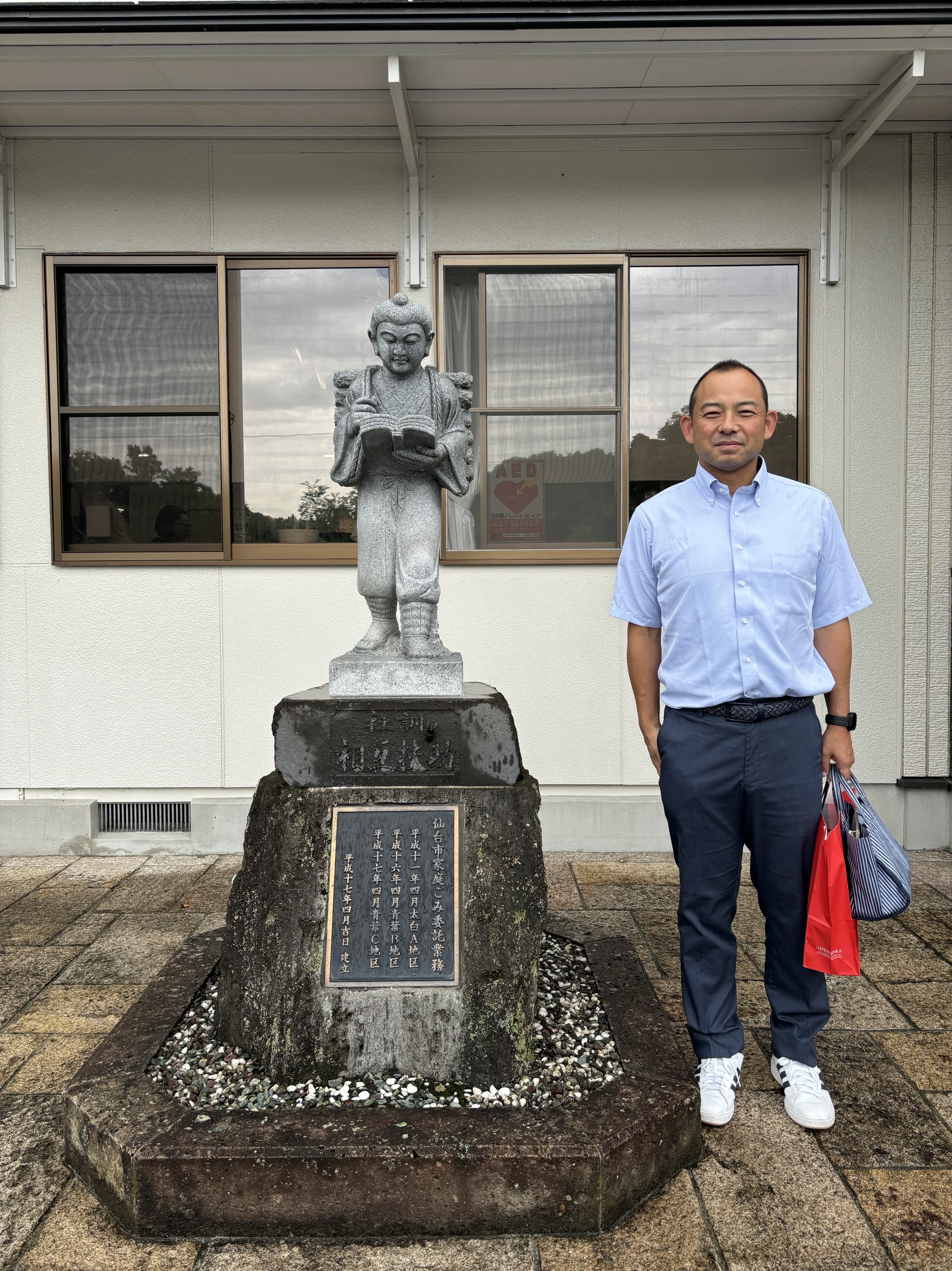 太陽光パネルの分別工場を見学した際、二宮金次郎像がありましたので記念に写真を撮りました。